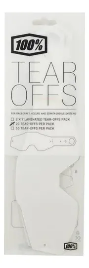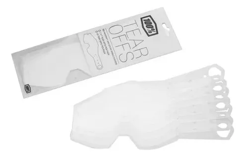 pack de 20 láminas de Tear Offs para antiparras de la reconocida marca 100%. Estas láminas son compatibles con los modelos de primera generación: Racecraft 1, Accuri 1 y Strata 1. Este pack es ideal para los motociclistas que buscan mantener su visión clara durante sus recorridos, ya que estas láminas son fáciles de retirar y reemplazar